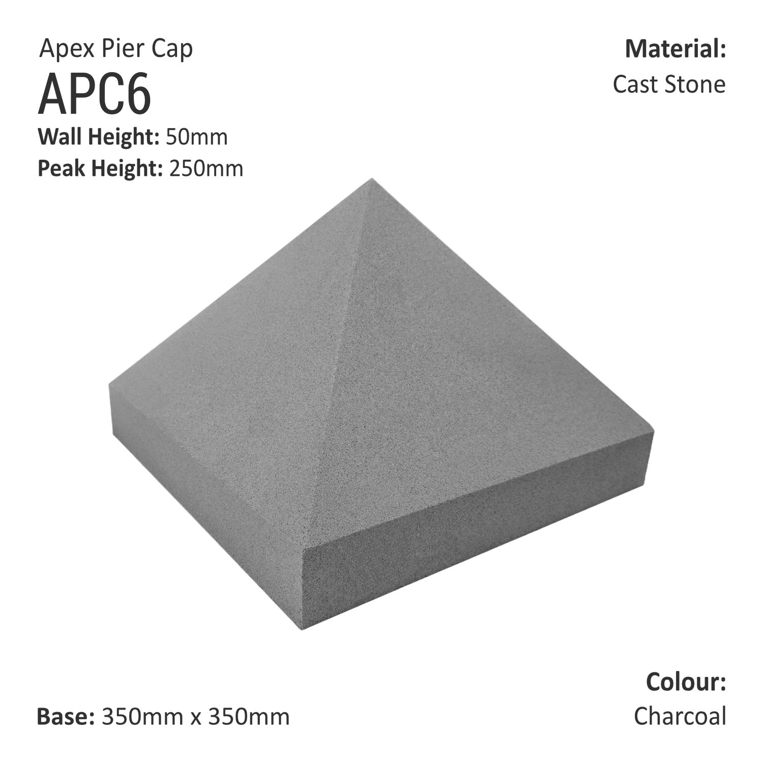 Pier Caps Tall Apex add a perfect finishing touch to your brick pillar and gate post. This decorative cast stone tall apex pier cap from UK Cast Stone features a 350 mm x 350 mm base and 250 mm peak height. Match any construction design with three different colours: Buff, Natural Portland, and Charcoal.